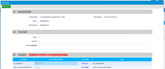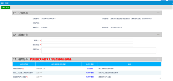 進入編輯頁面后,填寫必要信息和上傳相應附件后(網上質疑附件需電子簽章),確認無誤后點擊“確認發送”按鈕提交至代理機構。